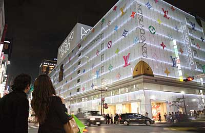 17日,在日本东京繁华的银座商业区,松屋百货大楼被用“路易·威登”的经典图案装扮成一只巨大的“路易·威登”旅行箱,以招徕顾客。