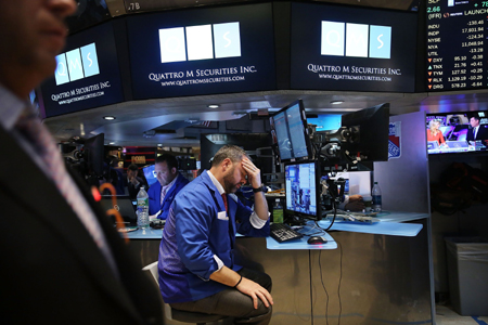 受经济数据不佳等因素影响,全球主要股市5日普跌。美国纽约股市道琼斯工业平均指数收于17928.20点,跌幅为0.79%;标准普尔500种股票指数收于2089.46点,跌幅为1.18%;纳斯达克综合指数收于4939.33点,跌幅为1.55%;伦敦股市《金融时报》100种股票平均价格指数收于6927.58点,跌幅为0.84%;德国法兰克福股市DAX指数收于11327.68点,跌幅为2.51%。图为5日交易员在美国纽约证券交易所工作。
