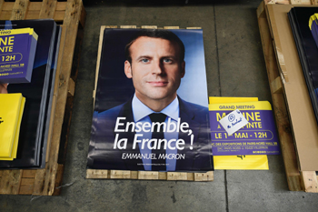4月26日,在法国首都巴黎以北的戈内斯,法国“前进”运动候选人埃马纽埃尔·马克龙的竞选海报堆放在仓库里。新华社/法新 |