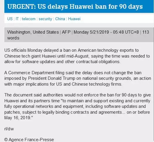 法新社报道称,美国官员周一决定,将对华为的禁令延迟90天实施,直到8月中旬才会生效,理由是,华为及其商业伙伴需要时间来升级软件以及处理一些合同义务问题。