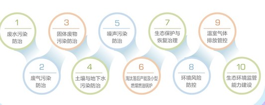 这“十大污染防治工程”包括:废水污染防治、固体废物污染防治、噪声污染防治、生态保护与恢复治理、废气污染防治、土壤与地下水污染防治、温室气体排放管控、生态环境监管能力建设、淘汰落后产能及小型燃煤燃油锅炉、环境风险防控。