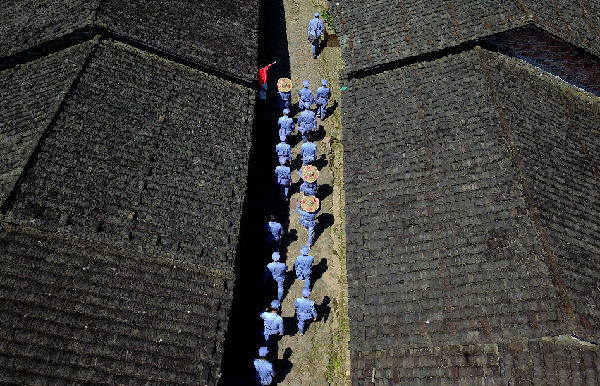 6月17日,记者们列队行进在长汀县南山镇中复村的红军街(无人机拍摄)。