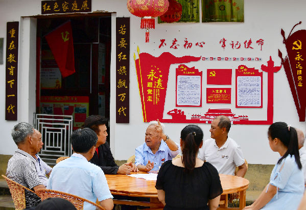 6月16日,钟宜龙老人(中)在向媒体记者讲述整理烈士名单的故事。