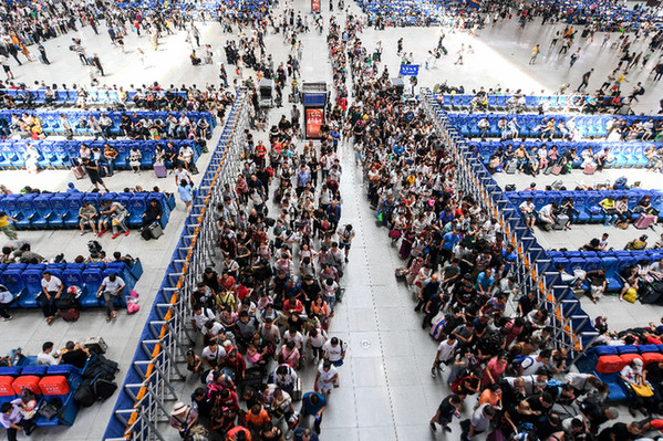 图为8月4日旅客在长春站候车大厅排队等候乘车。
