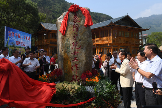 10月9日,在广西灌阳县新圩镇小龙村,袁隆平院士(前右三)出席工作站揭牌仪式。