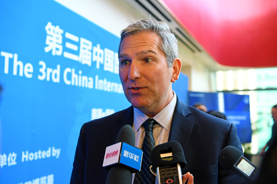 11月25日,在美国纽约,提供设施管理和配餐服务的美国企业爱玛客公司助理副总裁杰夫·策特尔在第三届中国国际进口博览会推介会后接受采访。