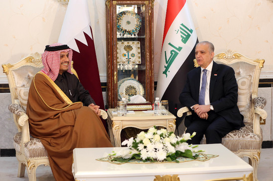 当日,伊拉克外长哈基姆与到访的卡塔尔副首相兼外交大臣穆罕默德·本·阿卜杜勒拉赫曼·阿勒萨尼举行会谈,双方商讨了缓和地区紧张局势等问题。 新华社发(哈利勒·达伍德 摄)