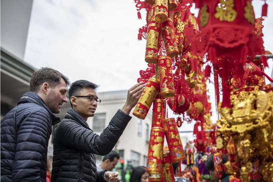 1月19日,市民在美国旧金山唐人街的春节花市上购买春节饰品。