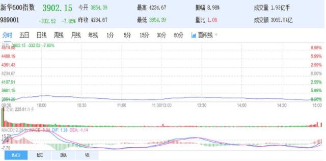 3日,新华500指数(989001)收盘下跌7.85%,报点3902.15,全天振幅8.98%。