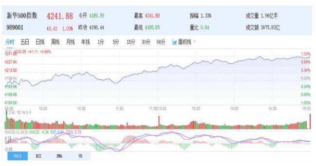 走势上看,新华500指数(989001)12日低开高走,呈现缩量上涨的强势走势,收盘于全天最高点。指数盘中最高触及4241.88点,最低触及4185.85点,全天成交量达1.96亿手,总成交额报3075.83亿元。
