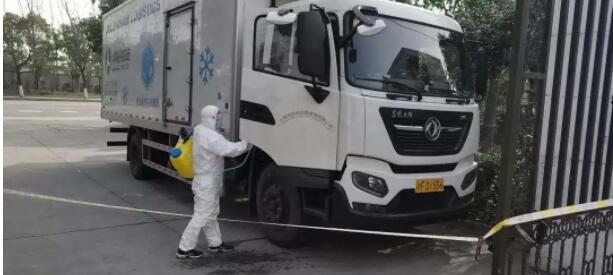 ▲ 工作人员为运输车消毒
