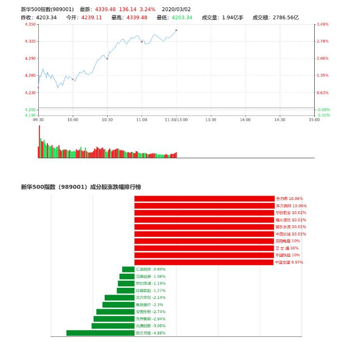 3月2日,新华500指数(989001)午盘报4339.48点,涨3.24%,成交额2786.56亿元;东方园林,合力泰,华创阳安领涨。