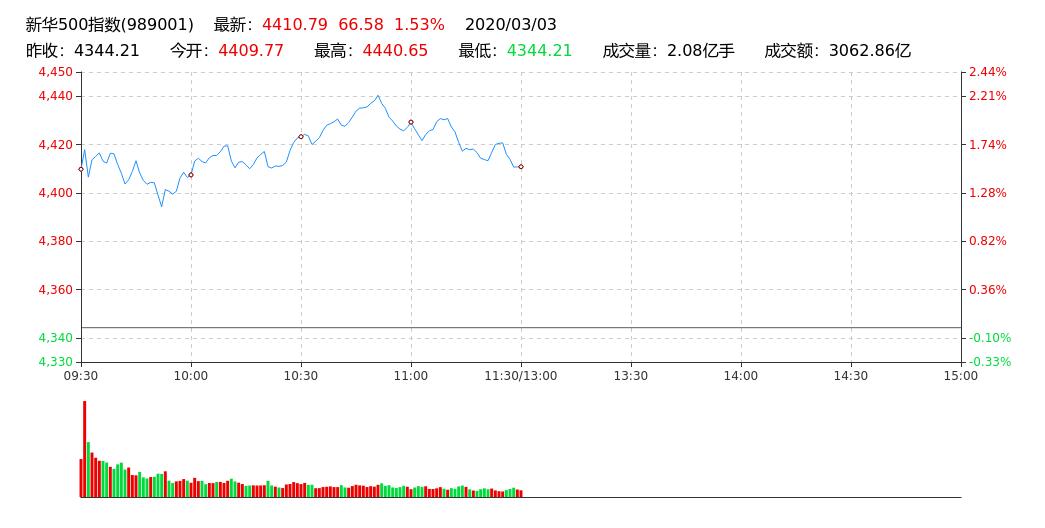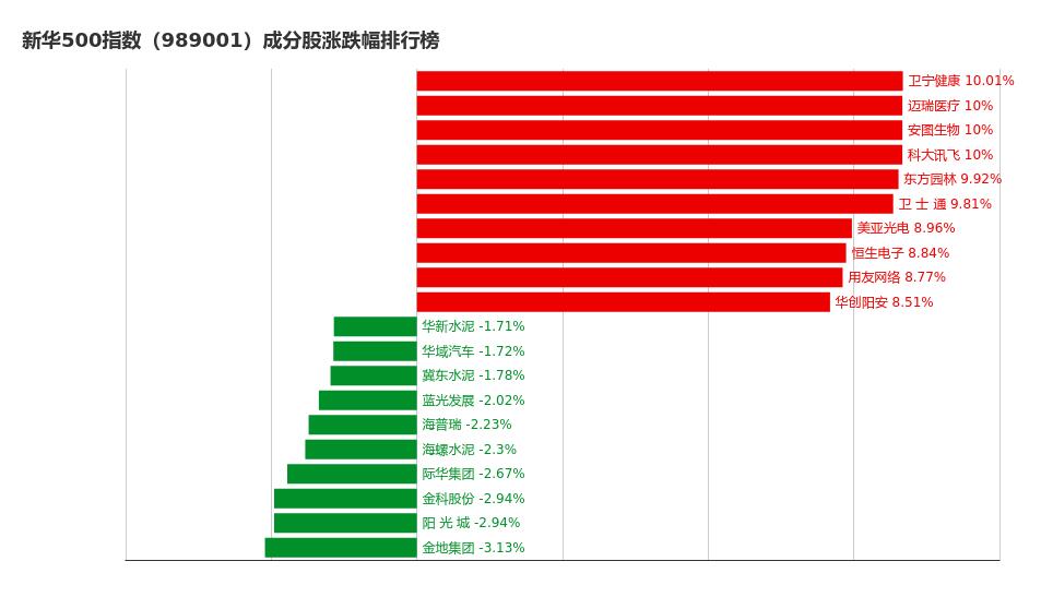 3月3日,新华500指数(989001)午盘报4410.79点,涨1.53%,成交额3062.86亿元;卫宁健康,科大讯飞,迈瑞医疗领涨。