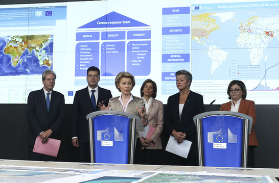 3月2日,在比利时布鲁塞尔,欧盟委员会主席冯德莱恩(前)在有关新冠病毒疫情的新闻发布会上发言。