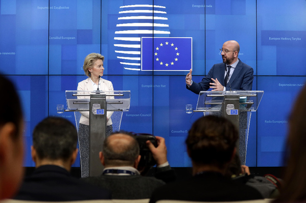 3月9日,在比利时布鲁塞尔的欧盟总部,欧洲理事会主席米歇尔(右)和欧盟委员会主席冯德莱恩出席新闻发布会。