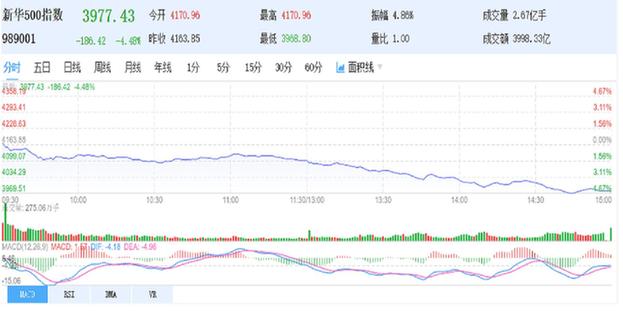 新华500指数(989001)16日收盘下跌4.48%,报3977.43点,全天振幅4.86%。