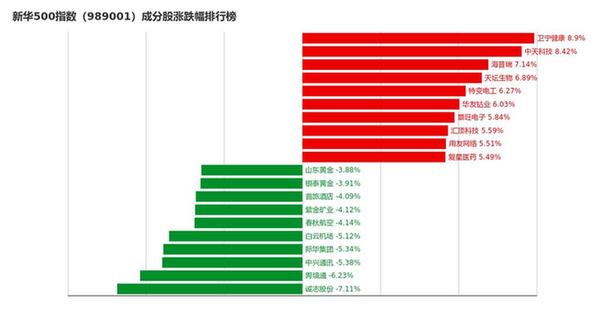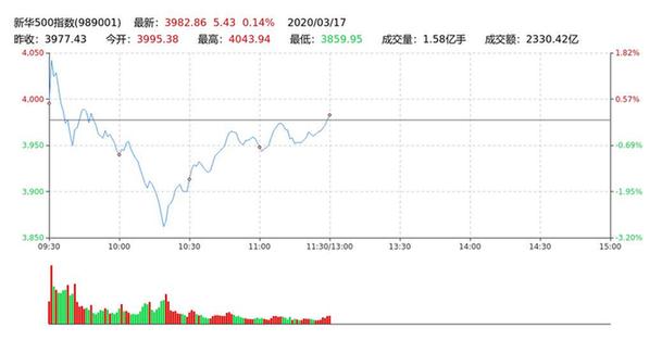 3月17日,新华500指数(989001)午盘报3982.86点,涨0.14%,成交额2330.42亿元;卫宁健康,中天科技,海普瑞领涨。