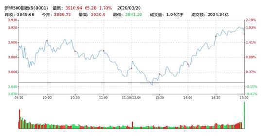 3月20日,新华500指数(989001)收盘报3910.94点,涨1.70%,成交额2934.34亿元;大参林 ,安迪苏 ,上海医药领涨。