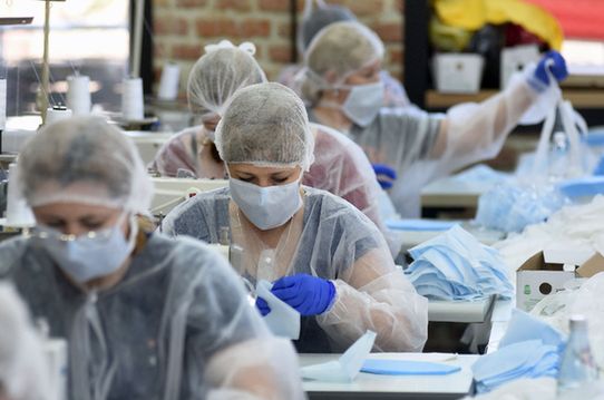 为抗击新冠肺炎疫情,乌克兰的一家服装公司将服装生产线改造后用于制作防护服和口罩。