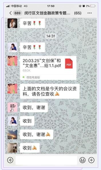 会前,区文创办已经通过邮件方式,发布了会议微信群的二维码,方便文创企业与金融专家进行互动答疑。会后,区文创办又将主讲嘉宾的PPT演示文件及时发送到微信群里,便于企业深度消化吸收,努力为企业提供周到服务。