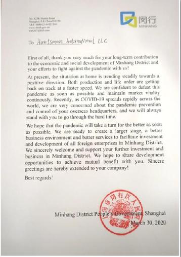 4月2日,闵行区向集团总部位于疫情防控重点国家的44家外资企业(跨国公司地区总部、储备总部及经济突出贡献外资企业)送慰问信,并向每家企业海外集团总部赠送5000只口罩用于防控疫情,感谢这些企业长期以来对闵行区经济社会发展所做的贡献,以及本次与我们共抗疫情所做的努力!