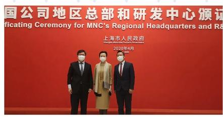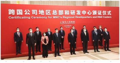4月8日下午,第32批跨国公司地区总部和研发中心颁证仪式在市政府举行,上海市代市长龚正为新认定的21家跨国公司地区总部和10家研发中心颁发证书,副市长许昆林致辞。