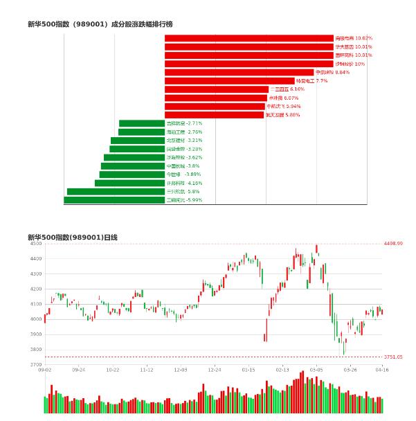 4月16日,新华500指数(989001)收盘报4063.72点,涨0.27%,成交额2215.76亿元;南极电商,国轩高科,华大基因领涨。