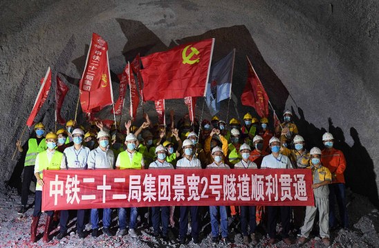 4月19日,中铁二十二局集团的建设者庆祝中老铁路景宽2号隧道胜利贯通。