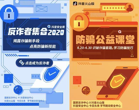 2020年4月20日,抖音宣布联合国家反诈中心、字节跳动安全中心,开展“抖音安全周”活动。“抖音安全周”是抖音连续多年开展的反诈、防诈活动,活动联合公安等政务媒体、反诈大V,基于抖音、抖音火山版平台,推出一系列反诈安全教育内容,利用有趣的短视频向抖音用户及社会公众普及反诈知识,也让众多抖音用户一起成为反诈者。