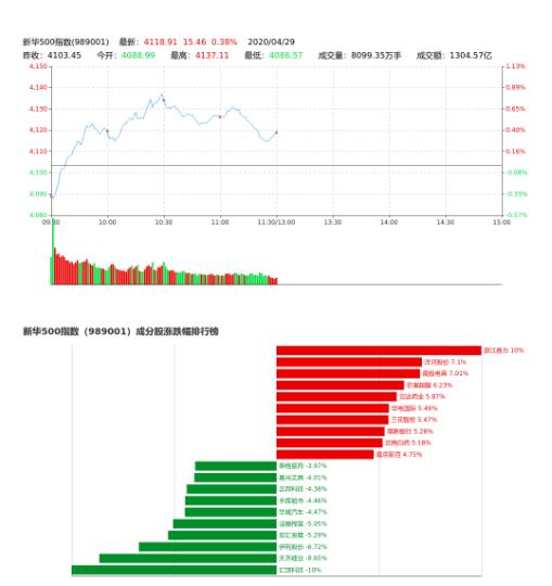 4月29日,新华500指数(989001)午盘报4118.91点,涨0.38%,成交额1304.57亿元;浙江鼎力,洋河股份,南极电商领涨。