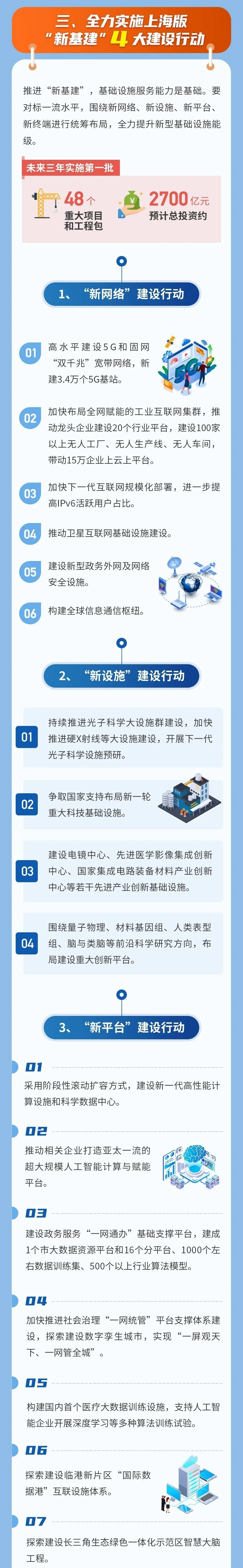 《行动方案》形成了上海版“新基建”“35条”,提出到2022年底,推动全市新型基础设施建设规模和创新能级迈向国际一流水平;初步梳理排摸了未来三年实施的第一批48个重大项目和工程包,预计总投资约2700亿元,包括新建3.4万个5G基站,新建一批科技和产业基础设施,新建10万个电动汽车充电桩,新增1.5万台以上智能配送终端等。详↓