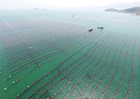 坐在自家二层客厅远眺,连江县下宫乡松皋村村民肖华腾可以看见自家的养殖网箱——一大片橙色的塑胶浮球在蔚蓝的海面上随波沉浮,映衬着他今年以来的心情。