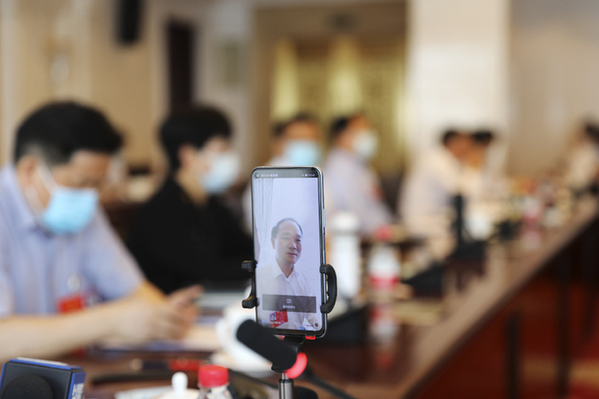 5月27日,全国人大代表李书福在小组审议时,通过视频方式连线相关部门工作人员。