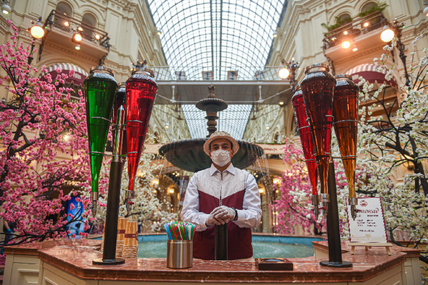 6月1日,在俄罗斯首都莫斯科,售货员在古姆百货商场工作。