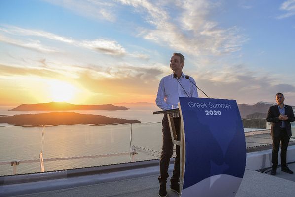 6月13日,希腊总理基里亚科斯·米佐塔基斯在桑托林(又译圣托里尼)岛参加一场新闻发布会。