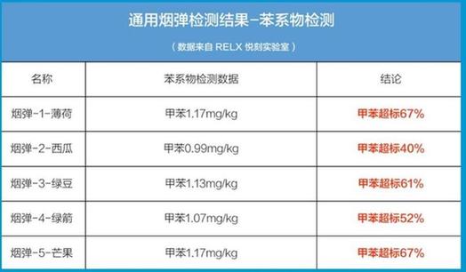 RELX悦刻消费预警显示,除雕刻烟杆外,市面上流窜的各种通配悦刻的发光烟弹、透明烟弹也并非RELX悦刻的官方产品。根据悦刻实验室的检测结果,这些烟弹大都存在使用劣质烟油,有害物特别是苯系物严重超标,且实际尼古丁含量与包装所示不符等各种问题。苯系物超标对中枢系统有麻醉作用,甚至有严重的中毒风险。若长期使用这种产品,将对健康带来极大威胁。