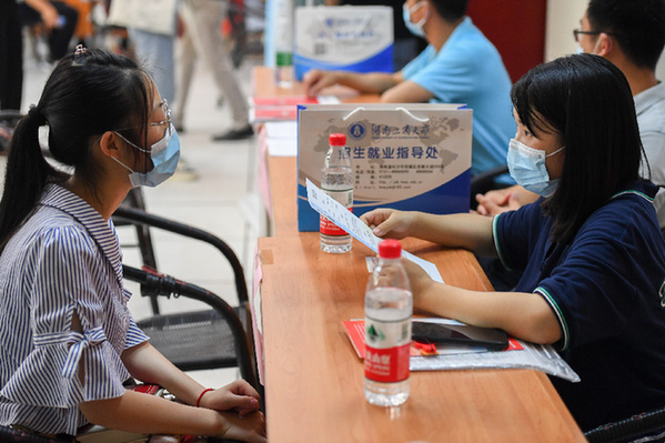 6月17日,在湖南工商大学专场招聘会上,求职者(左)在接受用人单位的面试。