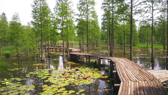 “池杉湖湿地已经成为‘鸟的天堂’,常年栖息和每年经此迁徙的鸟类总数超过十万只,全球极度濒危鸟类——青头潜鸭也把‘家’安在了这里。”池杉湖湿地公园负责人韩汇山说,在做好生态保护的前提下,他们也在探索如何进行湿地资源的合理利用。今年计划与科研院所合作,开发莲茶等健康产品链,收入用来反哺湿地保护,同时带动当地百姓致富。