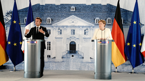 6月29日,德国总理默克尔(右)和到访的法国总统马克龙在德国北部小城梅泽贝格出席会晤后举行的联合记者会。
