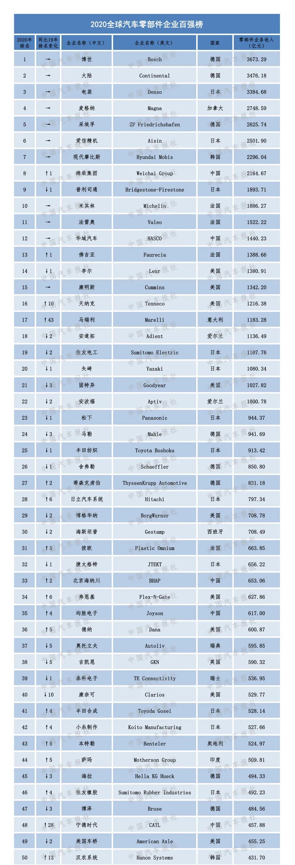 2020年全球汽车零部件企业百强榜单中,排在前五位企业是德国博世、德国大陆、日本电装、加拿大麦格纳和德国采埃孚。德国、日本、美国零部件企业排位靠前,是国际百强榜单中的主流企业,但仍有11家中国汽车零部件企业入选,分别是潍柴集团、华域汽车、海纳川、均胜电子、宁德时代、中航汽车、广汽零部件、玉柴集团、中策橡胶、中信戴卡、法士特集团。其中,潍柴集团零部件业务收入总额以2164.67亿元位居国际百强榜单第8位。这些中国企业代表了中国汽车零部件产业的先进力量,体现了中国自主零部件企业的实力。