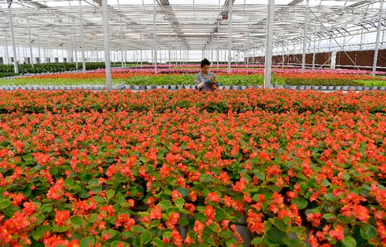 图为杨凌智慧农业示范园内,工作人员在管护温室花卉。