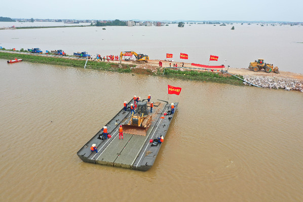 江西鄱阳县昌洲乡中洲圩决口封堵中,中国安能抢险队员利用动力舟桥运送抢险装备。资料照片