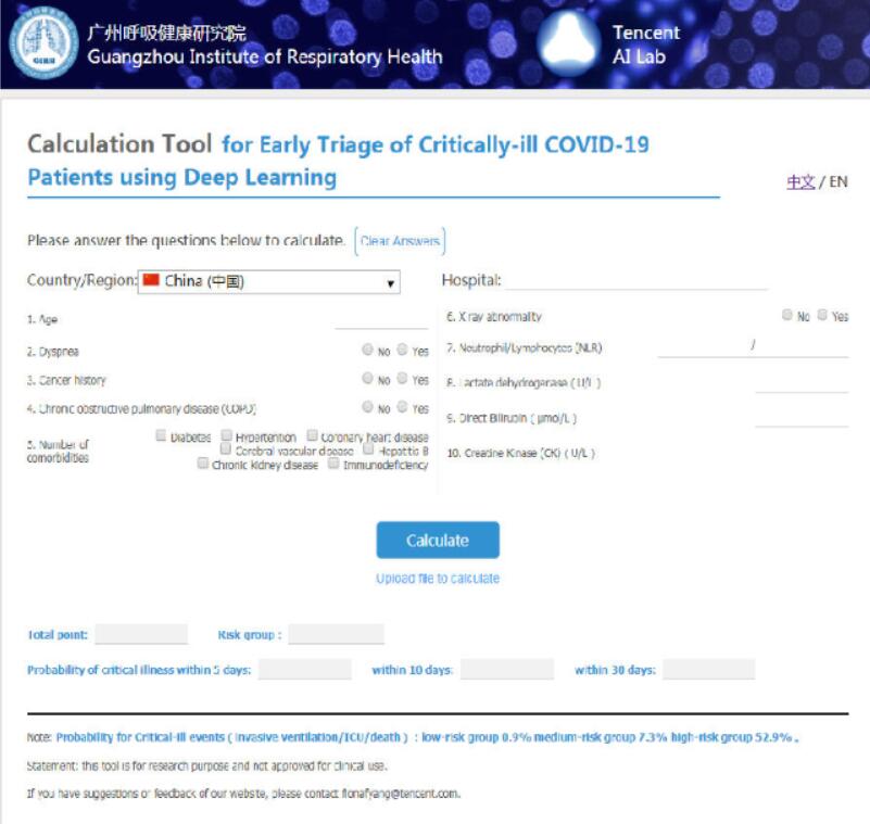此项研究基于人工智能深度学习所建立的生存模型,对COVID-19患者入院时的10项临床特征进行分析,可以帮助预测患者发展至危重病情的风险,如在患者住院期间持续采用此模型进行分析,预测结果会更加准确,有助于监测患者住院期间的风险趋势。依据此模型开发出的预测工具“COVID-19患者重症早期分诊系统”已经在线公开于https://aihealthcare.tencent.com/COVID19-Triage_en.html,临床医护工作人员也可以访问微信小程序获得这一工具。