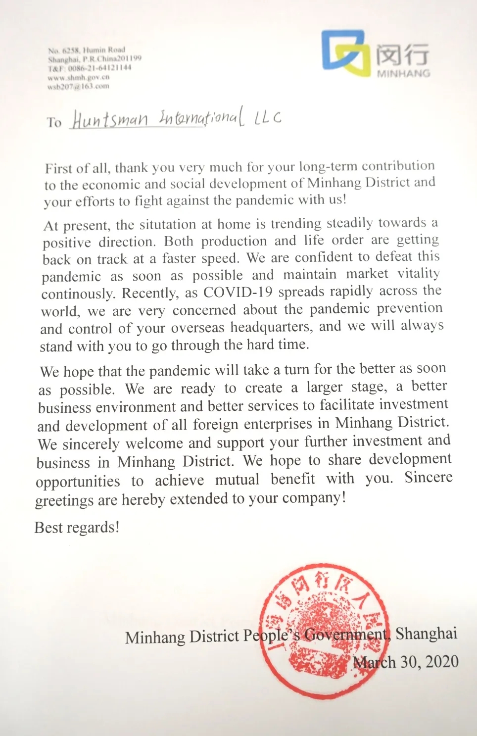7月22日中午,亨斯迈企业管理(上海)有限公司相关负责人专程来到区经委,把一面印有“亲和闵行服务 温馨营商环境”字体的锦旗送给区经委副主任沈丽,以此感谢区经委长期以来尤其是疫情期间给予这家跨国公司地区总部的帮助和支持。