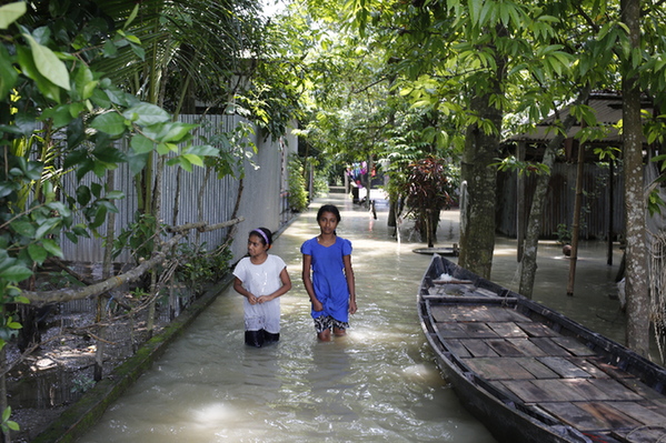 7月26日,人们在孟加拉国达卡的洪水中前行。目前南亚正值雨季,许多地区遭遇洪涝灾害。