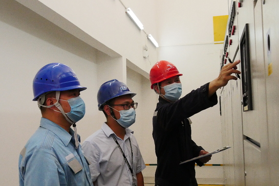 南方电网广东中山阜沙供电分局工作人员在皮阿诺家具公司配电房指导设备经理检查设备。马婷 摄