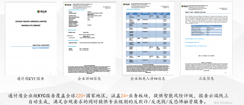 通付盾数字征信业务致力于为客户提供“了解其客户”的eKYC解决方案,结合公司信用认证平台等内部资源,采取高效响应机制,帮助客户快速得到需要的个人/企业信用信息,保障客户的业务安全并提高客户的业务效率;报告覆盖全球220+国家地区,涵盖24+业务板块,满足合规要求的同时提供专业级别的反欺诈/反洗钱/反恐怖融资服务。