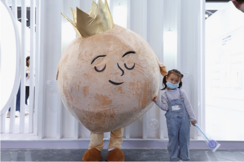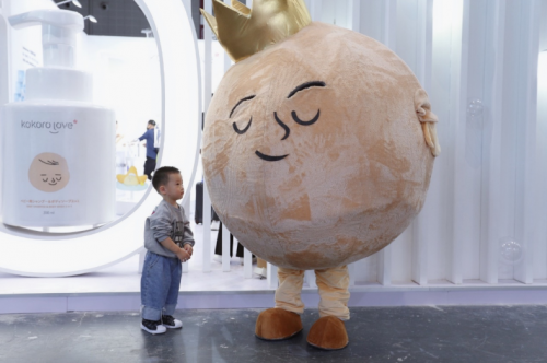 在kokoro love初葆的展馆外,还有一个非常可爱的小K人偶娃娃在与大家互动。小K人偶娃娃是kokoro love初葆颇具特色的卡通形象IP,kokoro love初葆所有产品的包装外观上都可以见到这个十分可爱的卡通娃娃。