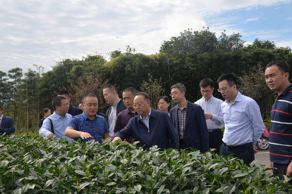 中国邮政集团有限公司四川省分公司党委书记、总经理廖涛在雅安市名山区解放村农民合作社茶叶基地调研。