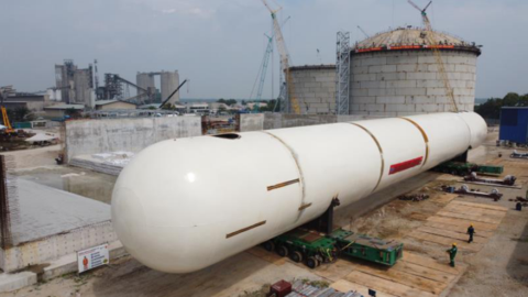 马来西亚子弹罐项目位于马来西亚巴生港港区,是新加坡GPS集团公司承建的一座LPG储存站。钢构公司负责4台3689m⊃3;LPG覆土子弹罐的设计、制造、安装,单台罐总长80米、重730吨,是钢构公司迄今为止承接的最长、最重的LPG覆土子弹罐项目。